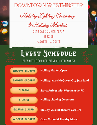 Kick off the holiday season in Downtown Westminster! Enjoy a festive evening filled with holiday cheer — from local craft and gift vendors to live performances, caroling, and a special appearance by Santa himself.
