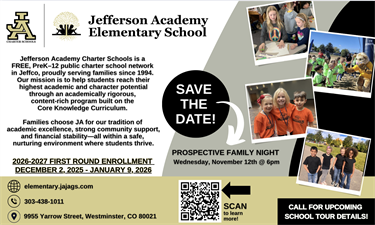 Open enrollment begins December 2nd, making this the perfect time to learn more and see if JA Elementary is the right fit for your family. We are a FREE, public charter school in Jeffco.
