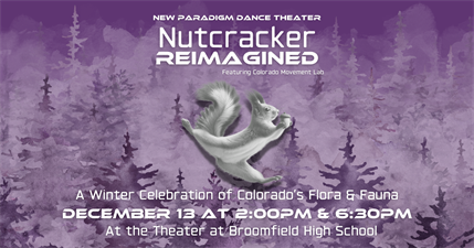 New Paradigm Dance Theater and Colorado Movement Lab are excited to continue the adventure in the production of Nutcracker Reimagined. This production is unlike anything anyone has seen before! In this professionally-produced rendition of a beloved classic, the characters are based on Colorado flora and fauna, including some additions to last year's production. The performance is a unique take on the timeless Tchaikovsky score, reimagined in a whole new way! The performance will take place at the Broomfield High School Theater on December 13, 2025.